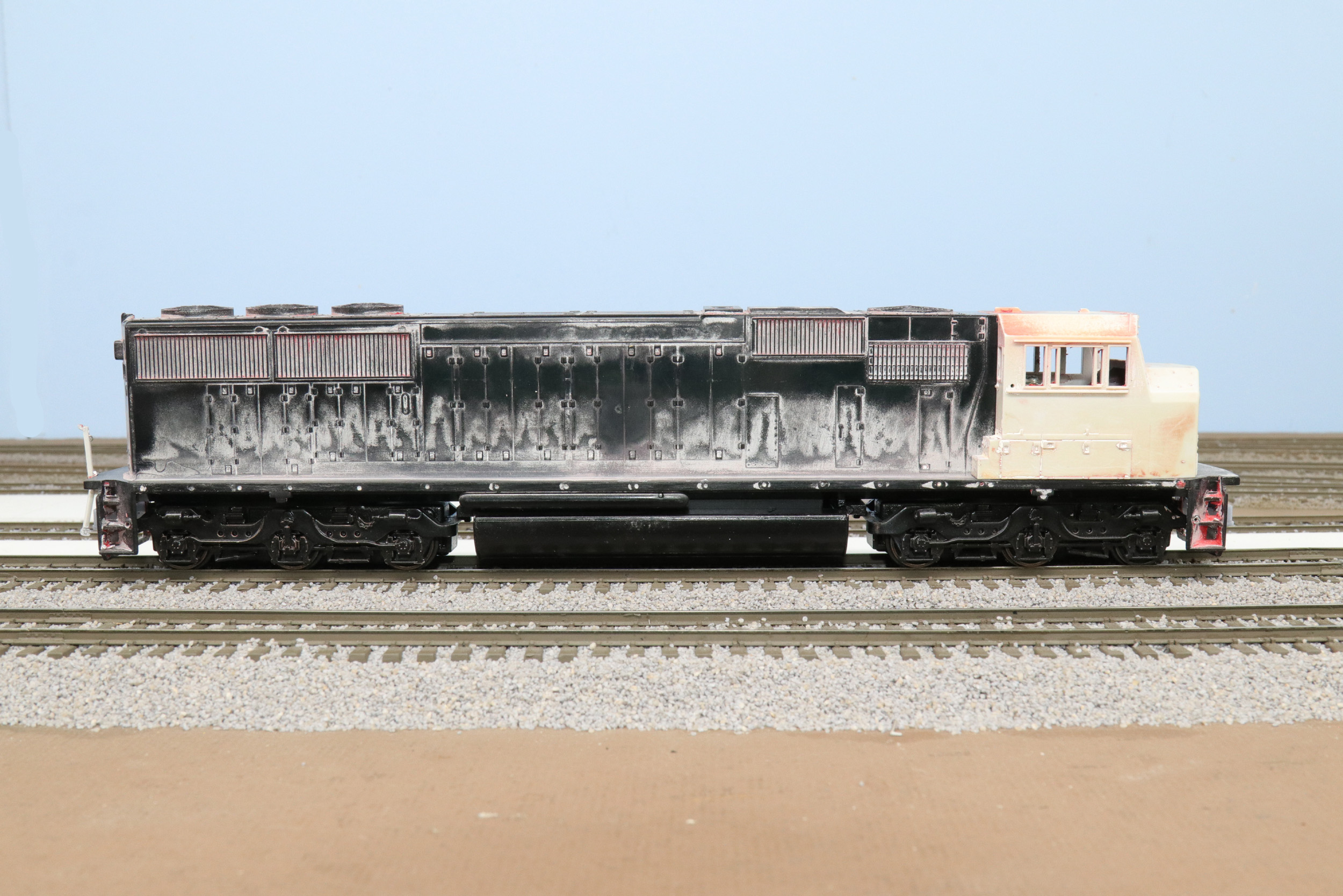 These photos were taken on 3-13-25 as received still with the Hi Rail wheels and couplers. I bought new scale wheels from American Models and installed my SD60 draft gear. That is a first for this SD60. I 3D printed these draft gear myself. They were previously bought from the now closed Shapeways